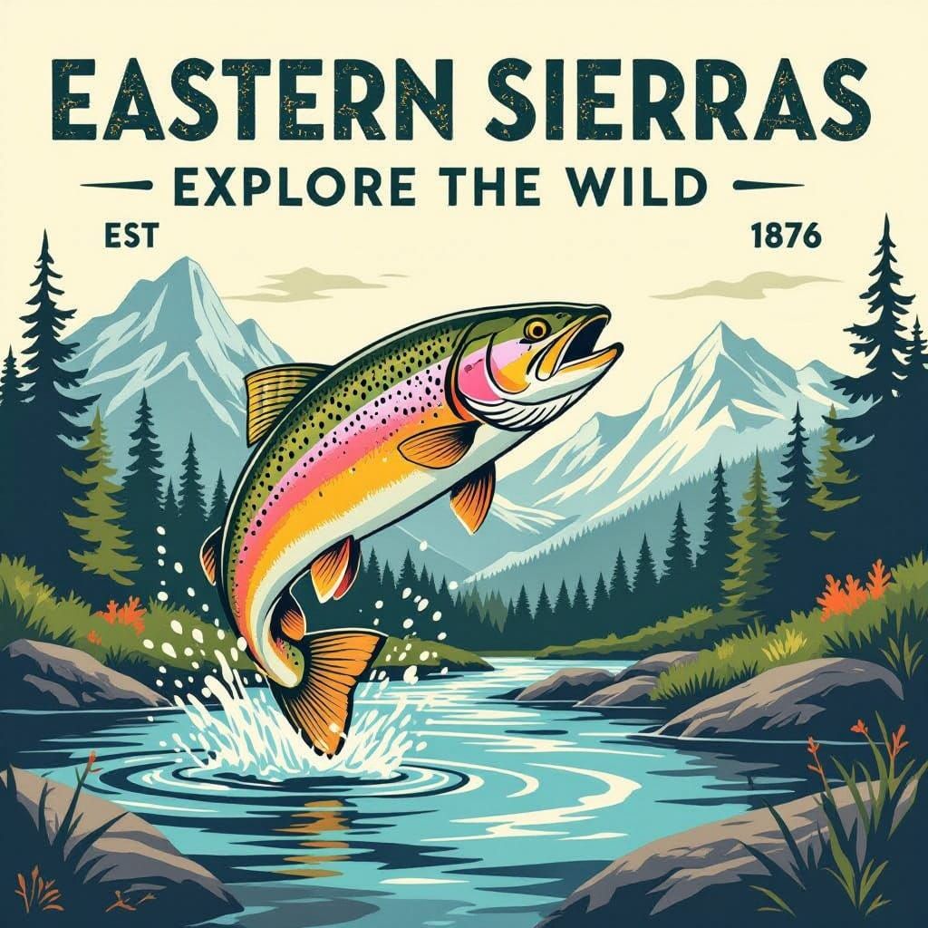 A vintage-style illustration of the Eastern Sierras alpine forest. A rainbow trout leaps from a clear mountain stream. Bold typography with distressed font and pale cream-colored palette completes the nostalgic charm.