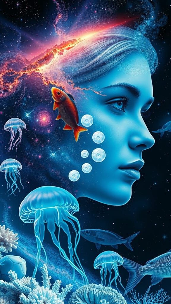 This image combines the mystique of space and the beauty of the deep sea, featuring a female Venus face amidst a dreamlike underwater cosmos where bioluminescent jellyfish and deep-sea creatures inhabit a colorful, nebula-like environment