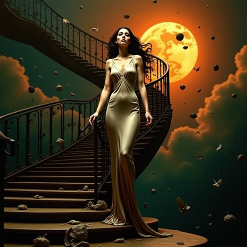 A hyperrealistic concept art image of a woman in an Art Deco gown on a spiraling staircase ascending into an abstract sky. The scene features atmospheric lighting and vivid color gradients.