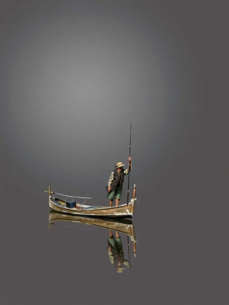 A peaceful old man stands on a small wooden boat, holding a fishing pole, as the calm water and misty morning background create a sense of stillness and simplicity, reminiscent of traditional fishing scenes