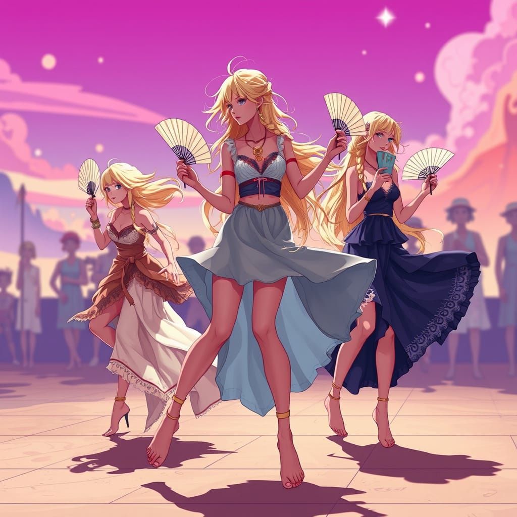 This image shows barefoot women with long blond hair dancing with fans. The digital artwork features a vibrant, cel-shaded anime style, deep colors, cinematic lighting, and 3D shading.