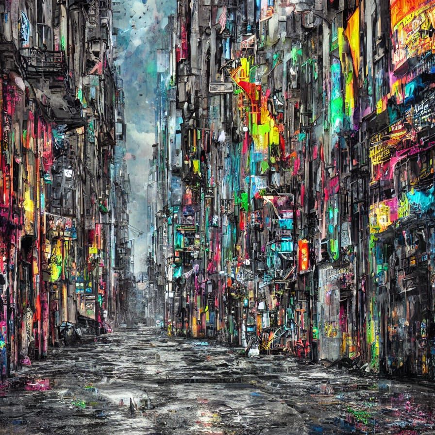 low angle shot of a city street at night with surrounding houses that are burnt and boarded up like detroit michigan, black and white color graffiti art, splash art, street art, spray paint, oil gouache melting, acrylic, high contrast, colorful polychromatic, ultra detailed, ultra quality, CGSociety ...