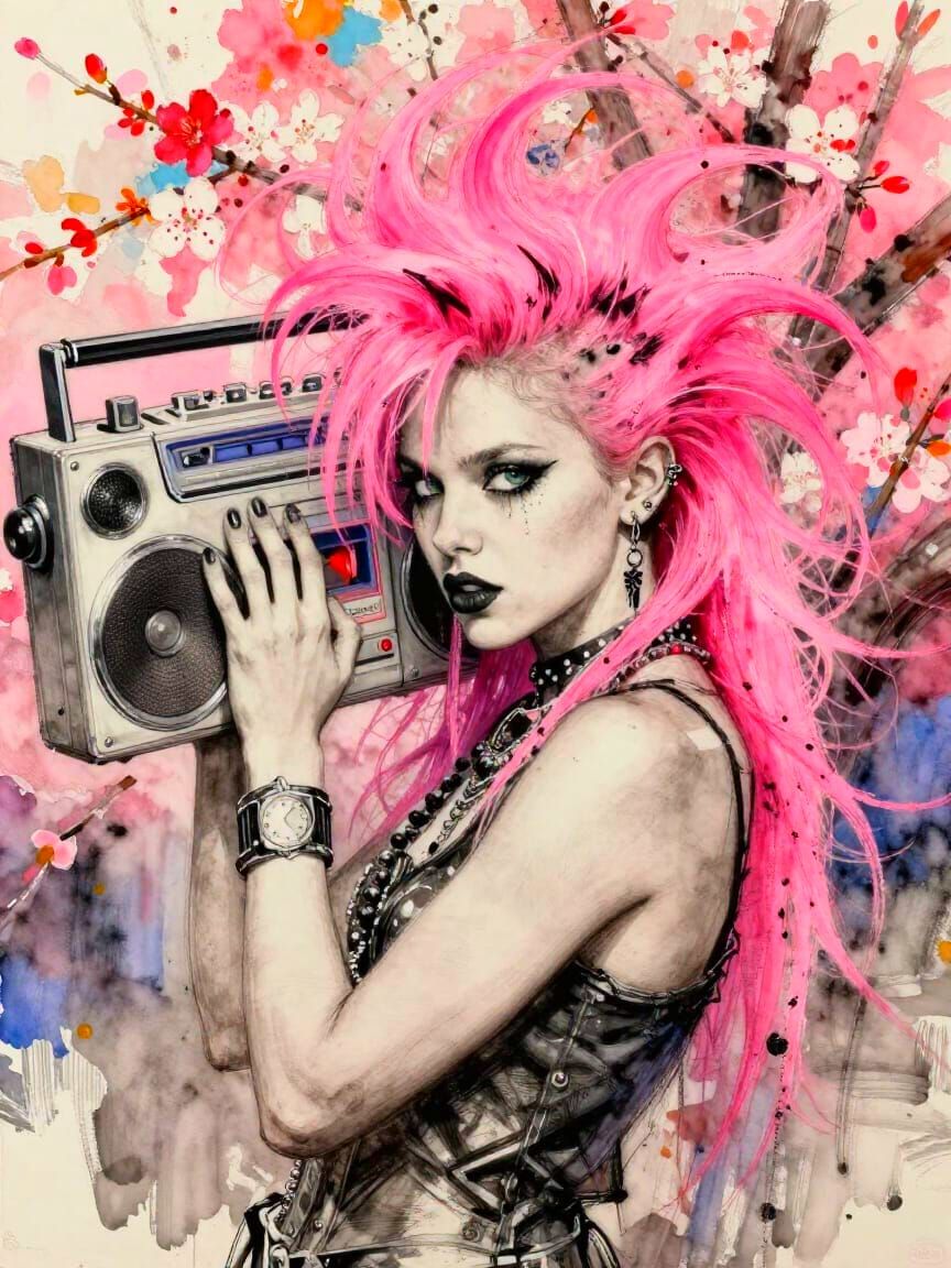 This image features a detailed watercolour sketch of a punk girl with vibrant, flowing hair holding a cassette player. The background is a colourful cherry blossom scene, rendered with thick brush strokes.