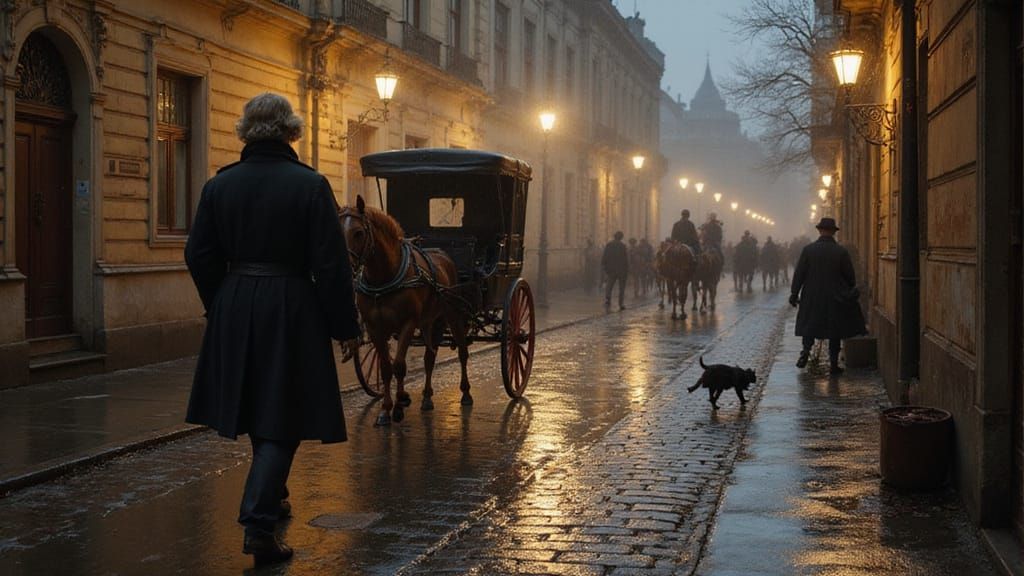 This oil painting captures Beethoven walking on a wet Vienna street in the 18th century, with horse carts and a cat. Features dramatic lighting in a Dutch Golden Age style.