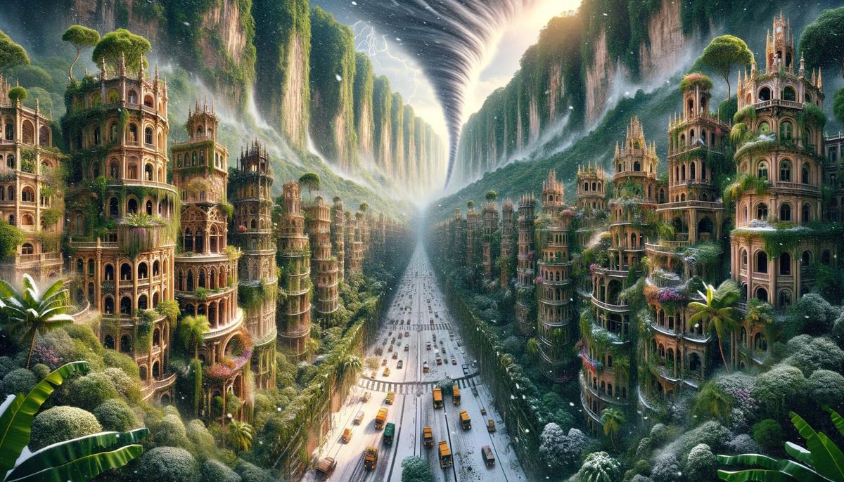 A panoramic view of a tropical city bisected by a canyon, experiencing a winter storm. Snow and lightning clash with the lush vegetation as tornadoes ravage the architecture in a gothic aesthetic.