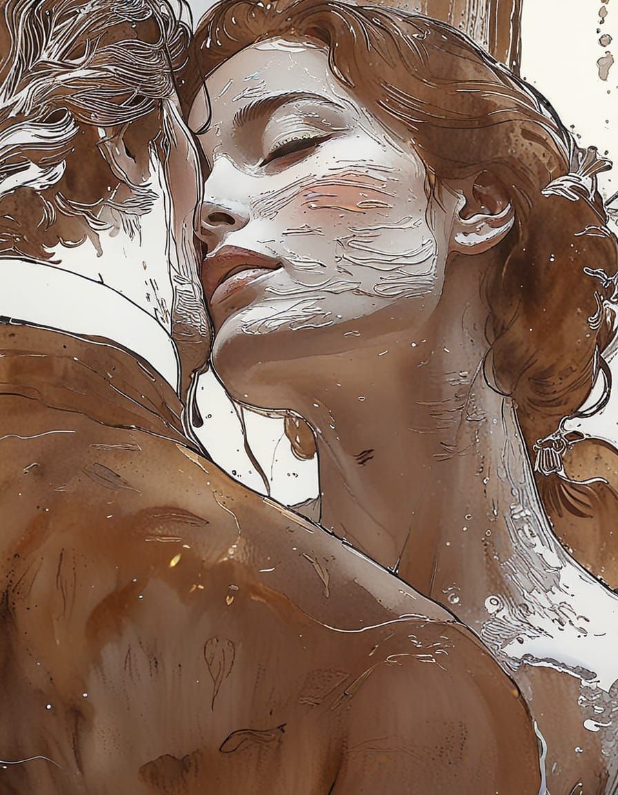 A watercolour and ink illustration of a couple kissing in a close-up shot. The artwork features expressive brushstrokes and vibrant ink accents, enhanced by warm golden lighting.