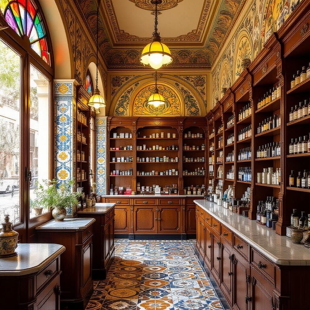 A detailed view of a vintage chemist shop in Spain. The shop features floral patterned tiles in an art nouveau style, with warm colors and soft lighting.