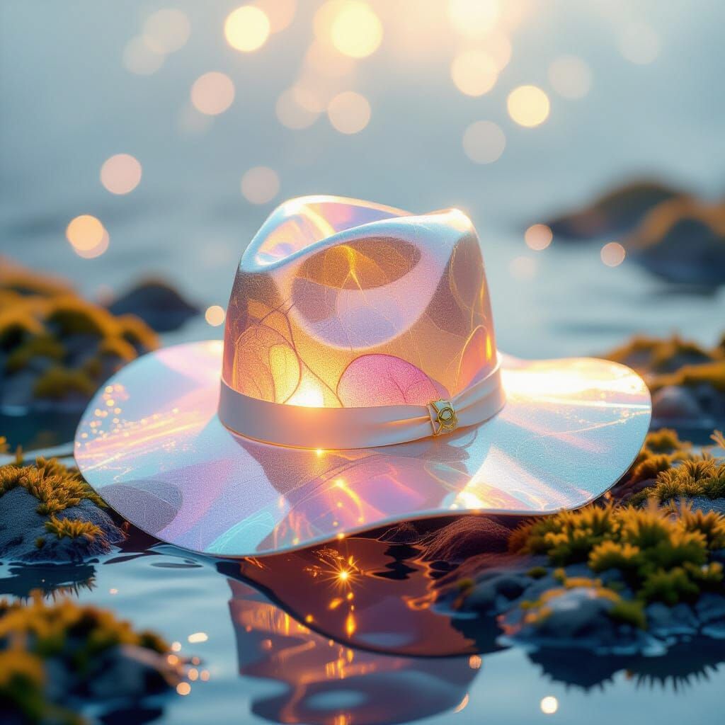 This image features a sea glass hat with shimmering gold and glass details. It blends romantic, luminous, and eco-futurist elements with vibrant pinks, blues, and yellows.