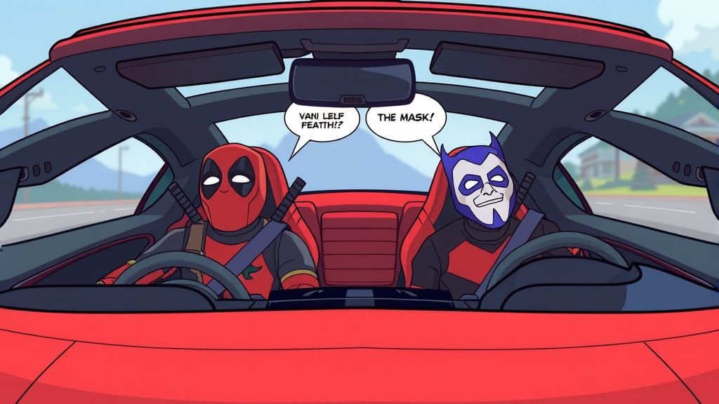This image shows a cartoon of Deadpool and The Mask singing loudly in a luxury sports car with a panoramic roof. The image uses vibrant colors and motion lines to create a humorous scene.