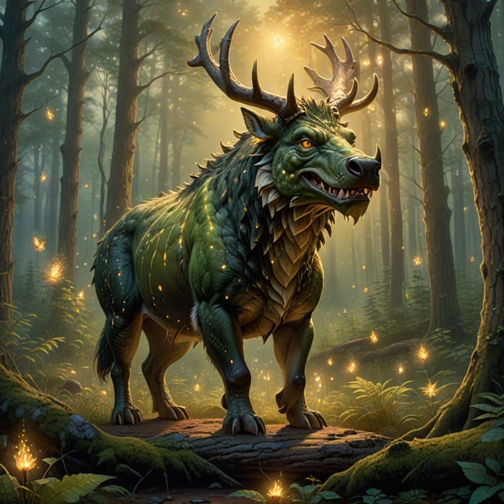 A mystical portrait of a Hodag in its natural environment. This image depicts a magical forest scene with golden lighting, soft mist, and fireflies in a dreamy, hyper-realistic style.
