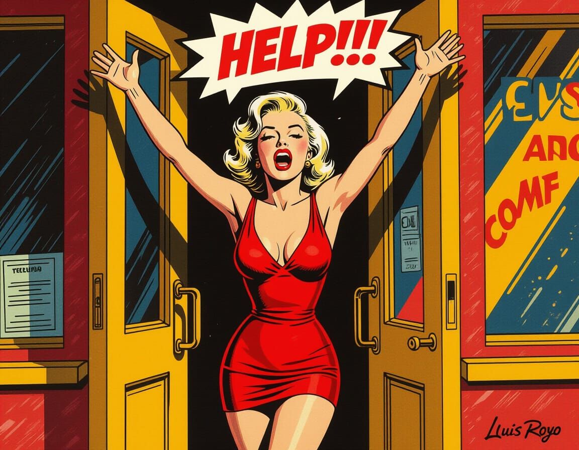 This image depicts Marilyn Monroe in a red dress outside a Los Angeles café, screaming for help. The artwork is reminiscent of vibrant 1970s film posters, with bold lines and dynamic shading.