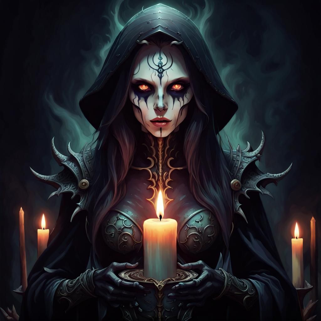 A striking picture of an arrogant dark witch illuminated by candlelight. The image has a mesmerizing quality and is rendered in a sci-fi aesthetic.