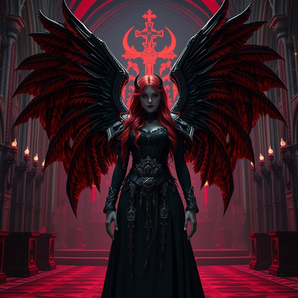 This image features a striking gothic angel with dark attire, blood red hair, and shining metal jewelry, set against a dramatic backdrop of a gothic church with a devilish altar, bathed in warm, blood red light with purple and yellow accents, showcasing a blend of dark fantasy and art nouveau styles with...