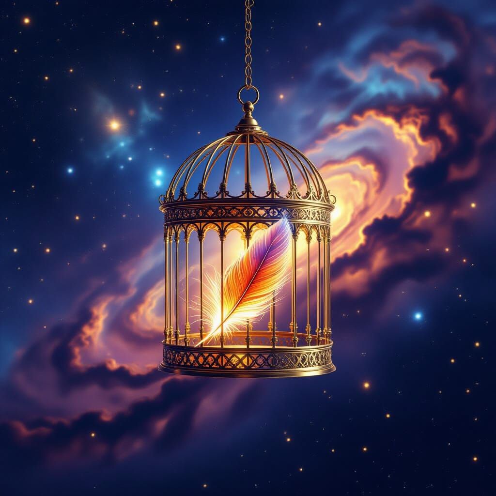 This image depicts an ornate brass birdcage with delicate filigree, suspended in a vast, starlit nebula. A glowing phoenix feather rests inside, set against a backdrop of cosmic colors and distant galaxies, rendered in a fantasy illustration style with cinematic lighting.