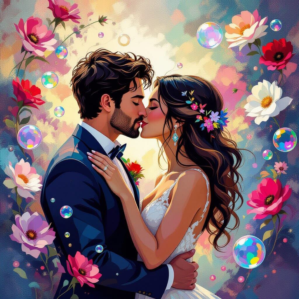 A vibrant image of a humanoid couple kissing amidst flowers and bubbles. The artwork showcases an abstract style with bold brushstrokes and kaleidoscopic colors, reminiscent of cubism with a dreamy aesthetic.