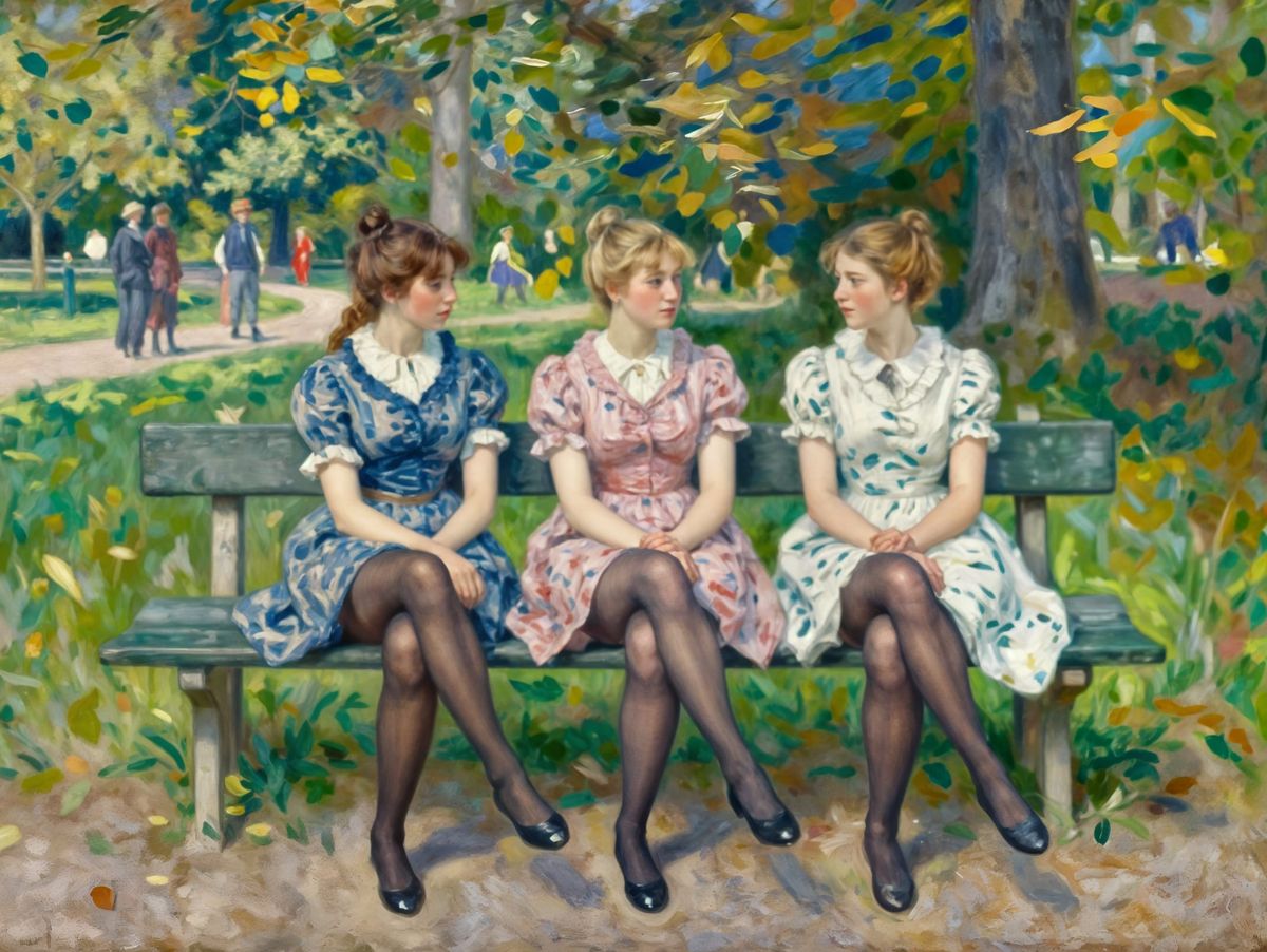 This image shows three Danish women in 19th-century style dresses and pantyhose sitting on a park bench in Copenhagen. Rendered in luminous impressionism, capturing a lush city scene.