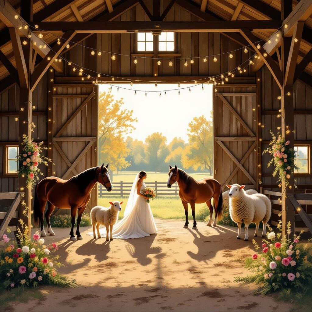 Easily create your own unique barn wedding images with farm animals using our free AI generator. Perfect for invitations!