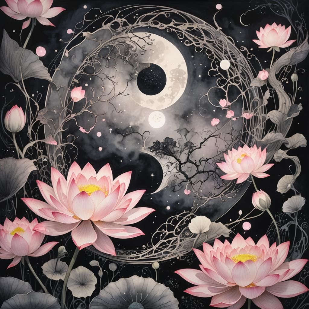 Single glowing ying yang dark pink & pearl WHITE lotus under pale pink & WHITE moonlight, LED illuminated, magical fantasy, zentangle, eldri...
