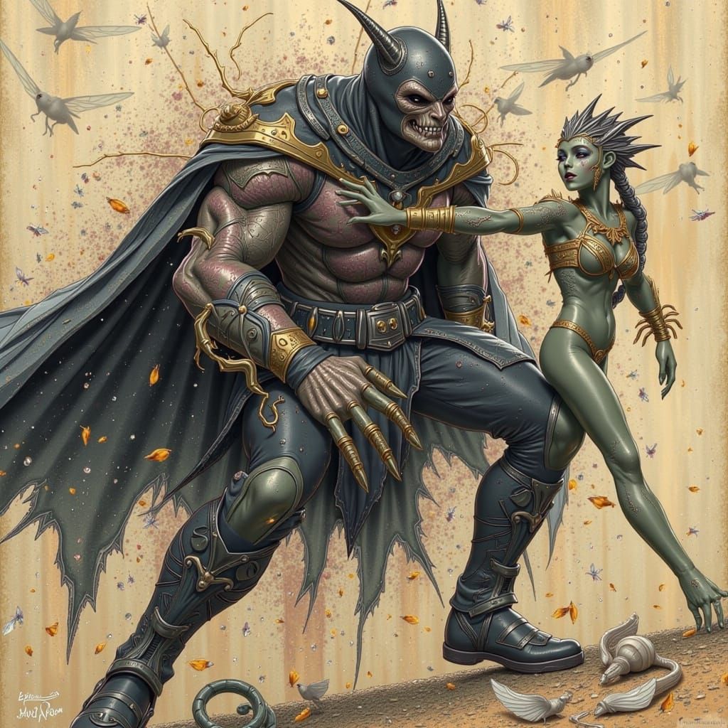 This image depicts a superhero in a tattered cape fighting the grotesque villain Bak Brom. The artwork is reminiscent of Francis Bacon, H.R. Giger, and Zdzisław Beksiński, with a dark, gritty, watercolor style.