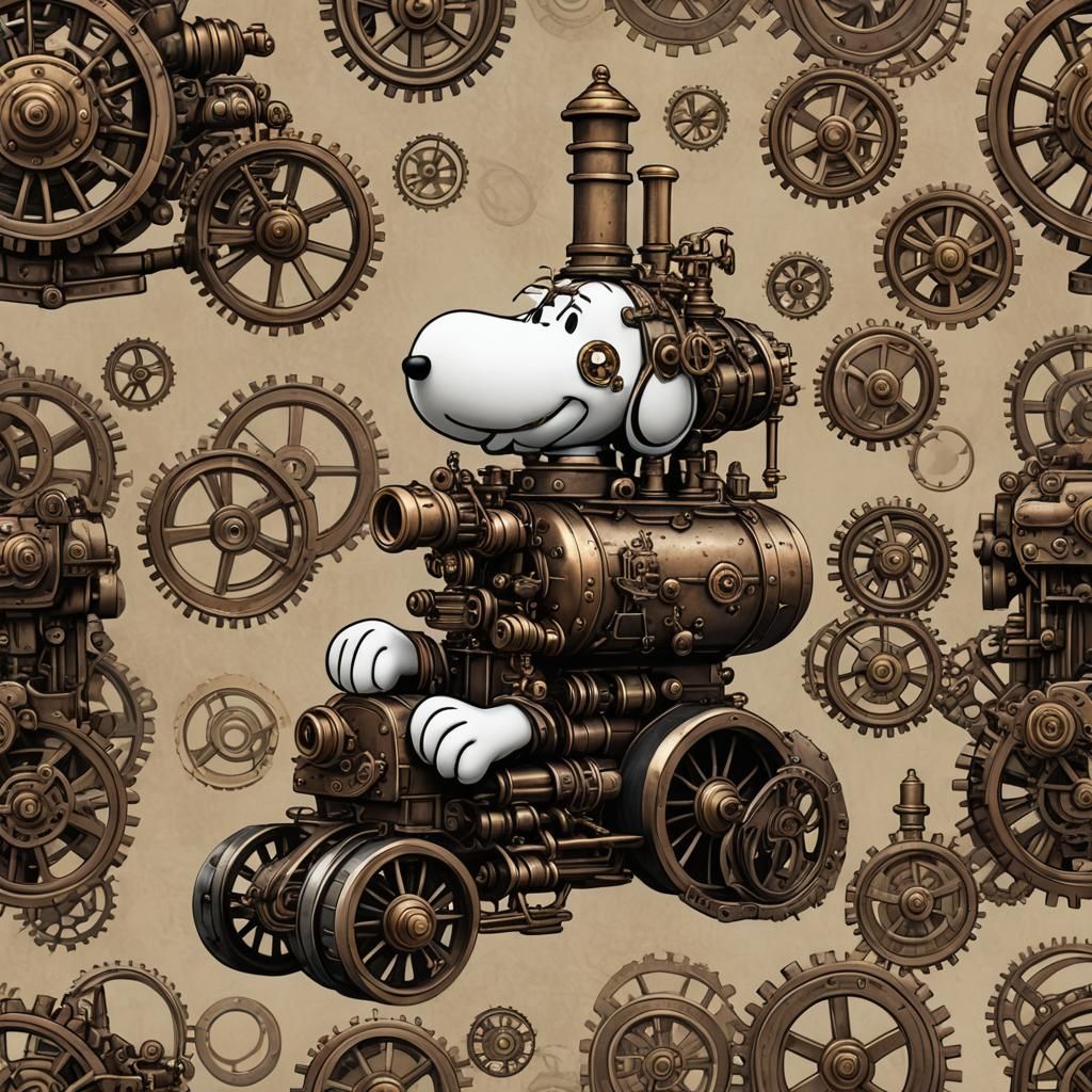 A whimsical steampunk-style image featuring Snoopy integrated with a complex network of gears, pipes and other elements of a steam-powered engine.
