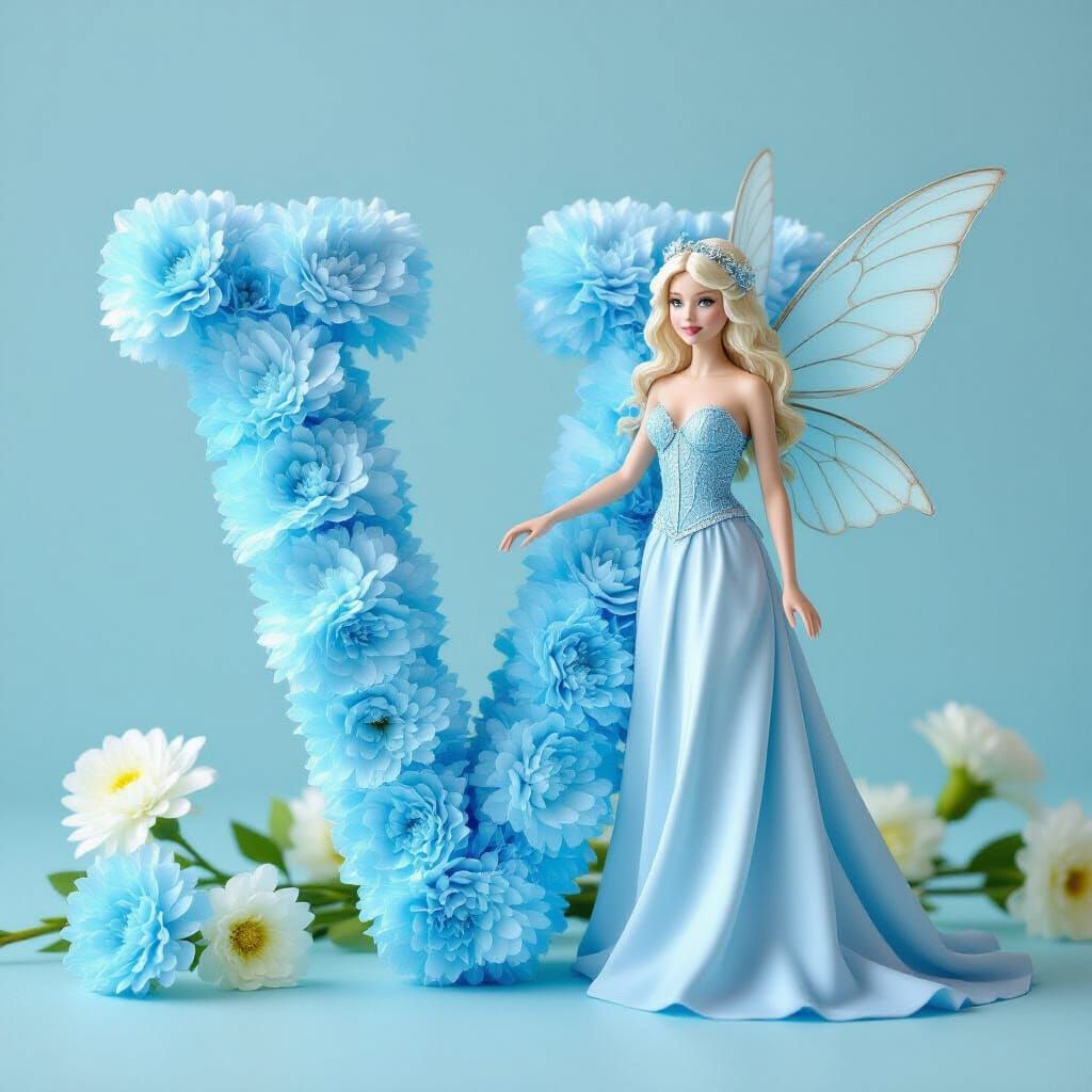 This image features a delicate light blue fairy positioned beside the letter V, which is artfully constructed from light blue carnations.