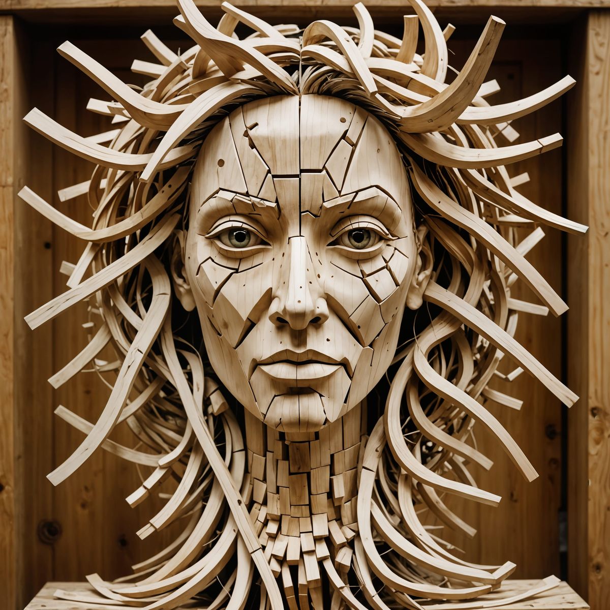 A kinetic sculpture featuring small wooden pieces suspended by wires. The shifting arrangement of wood fragments creates a monstrous, abstract female face in constant motion.