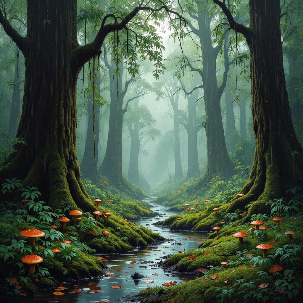 This image captures a dense, ancient forest during a rain shower. Muted light filters through dripping leaves onto a mossy floor with a meandering stream. Rendered with lush, detailed brushwork and dramatic lighting.