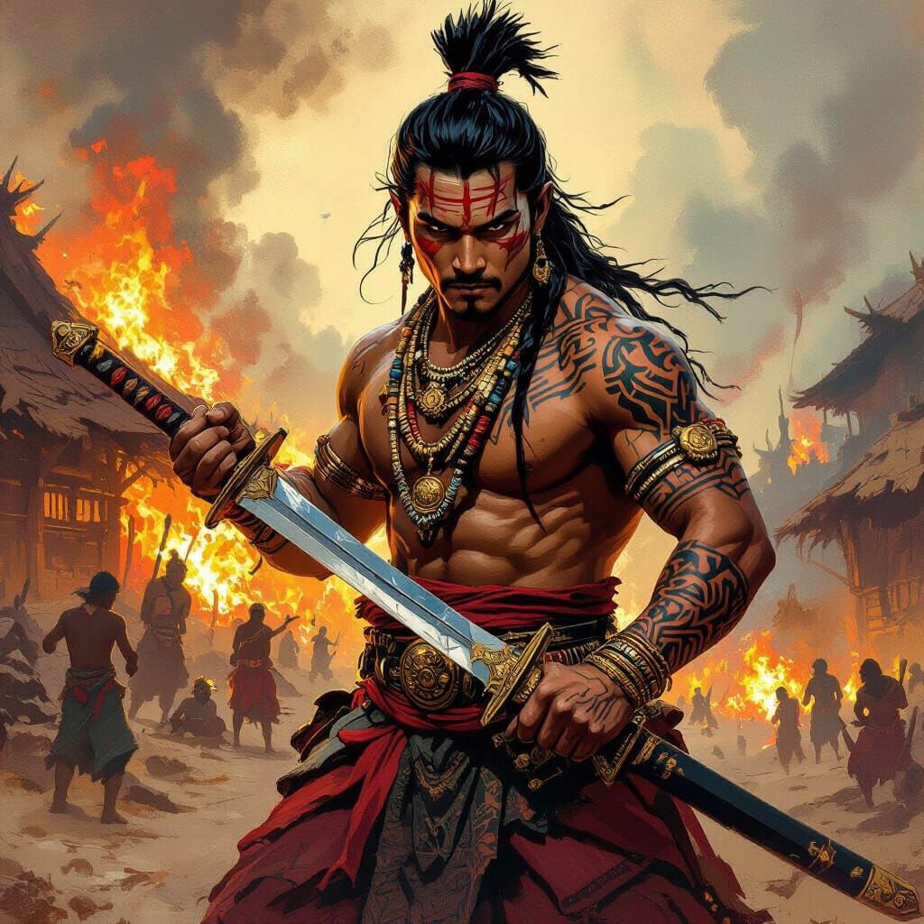 A dramatic image of an ancient Myanmar warrior with tribal tattoos holding a sword, posed in front of a burning village. This digital artwork features dynamic brushstrokes and intense golden lighting.