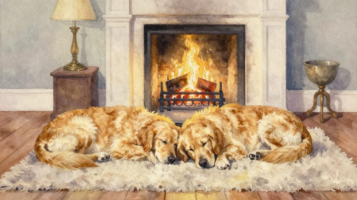 This image shows two golden retrievers sleeping by a fireplace. It is rendered in a gentle watercolor style with soft brushstrokes and warm, tranquil colors.