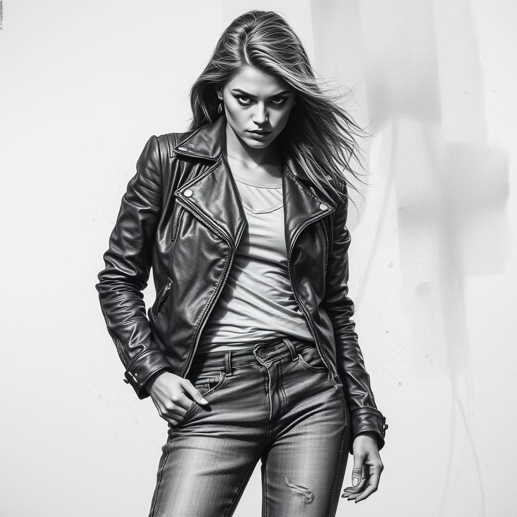 This image features a striking woman in a bold Chiaroscuro style, characterized by strong contrasts of black and white, evoking a sense of drama and intensity.