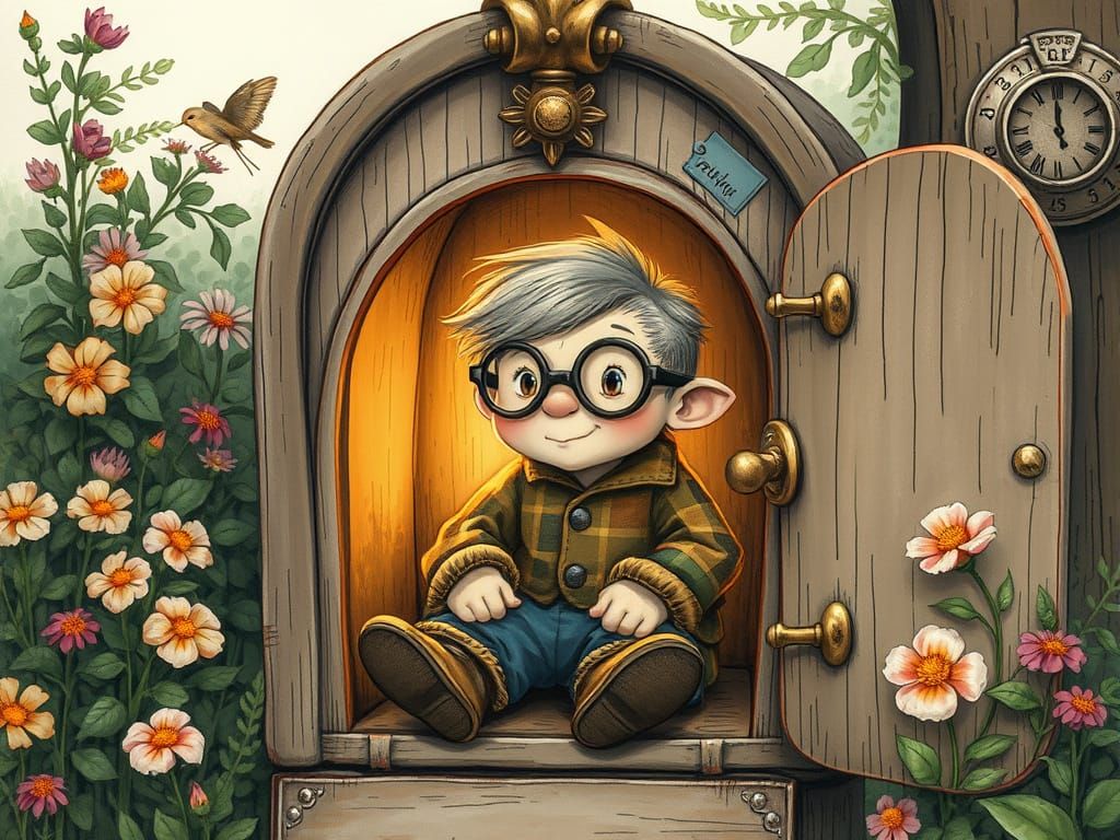 This charming image shows a tiny, bespectacled person living in a beautifully decorated mailbox, surrounded by lush greenery and vibrant flowers, in a warm, golden light, with intricate details reminiscent of classic children's book illustrations.