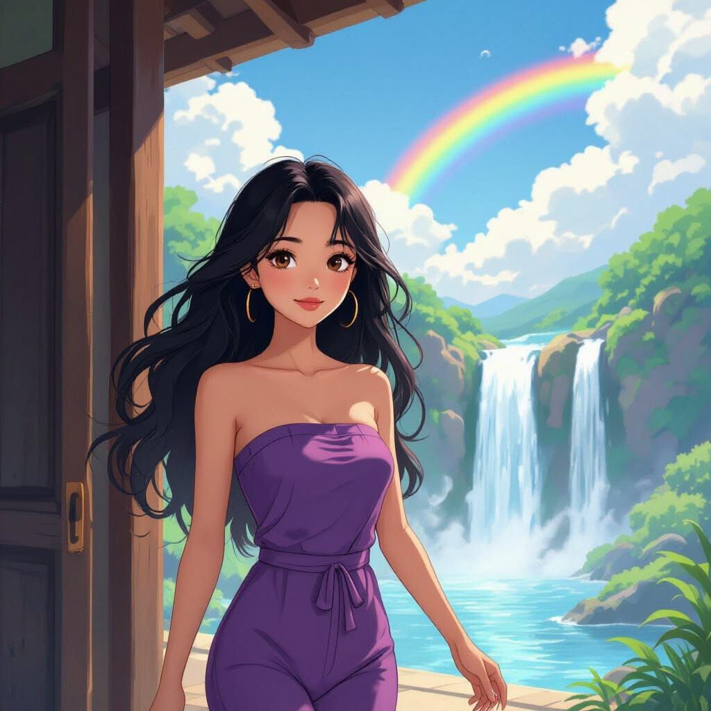 This image shows an Asian woman emerging into a vibrant world with a waterfall and rainbow. The artwork blends whimsical animation with painterly digital art and vivid colors.