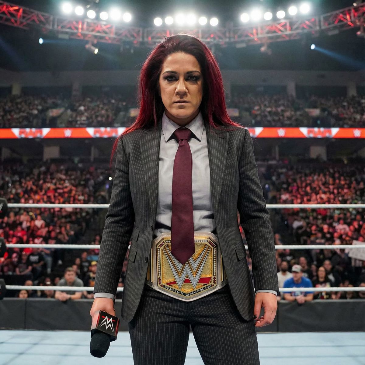 Bayley stands at the centre of the wrestling ring, gripping a microphone with deliberate poise as she prepares to unleash a cutting promo. Her long, wavy ash-blonde hair cascades over her shoulders, parted sharply to enhance the severity of her glare. She wears a tailored charcoal suit with subtle pinstripes, a pale grey shirt, and a deep burgundy tie knotted flawlessly at her collar, while the gleaming WWE Women’s Championship rests securely around her waist. Intense arena lighting casts dramatic shadows across her features, amplifying her dominance as the crowd watches with a mixture of awe and unease