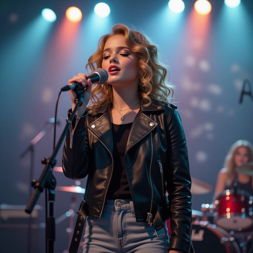 This image shows a singer with golden hair on a brightly lit stage. The hyperrealistic image captures a moody atmosphere with cinematic quality and intricate details.