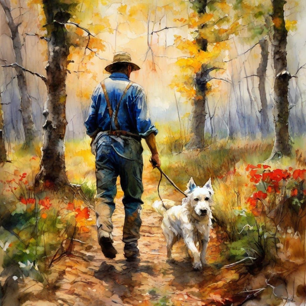 Create your own beautiful encaustic watercolor paintings of farmers, dogs and oak forests for free with AI.