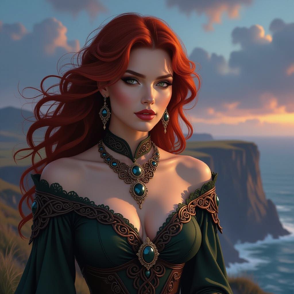 A woman with a voluminous chest and fiery red hair, adorned in intricate Celtic knotwork jewelry crafted from polished obsidian and moonstone, stands on a windswept Scottish highland cliff. Detailed concept art style, sharp, dramatic lighting casting long shadows across the rugged landscape. Evocative ...