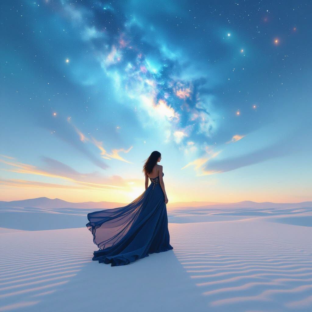 A striking image of a woman in avant-garde couture on a desert at twilight. Features a swirling nebula sky and dramatic golden hour lighting, rendered in hyperrealistic digital painting.