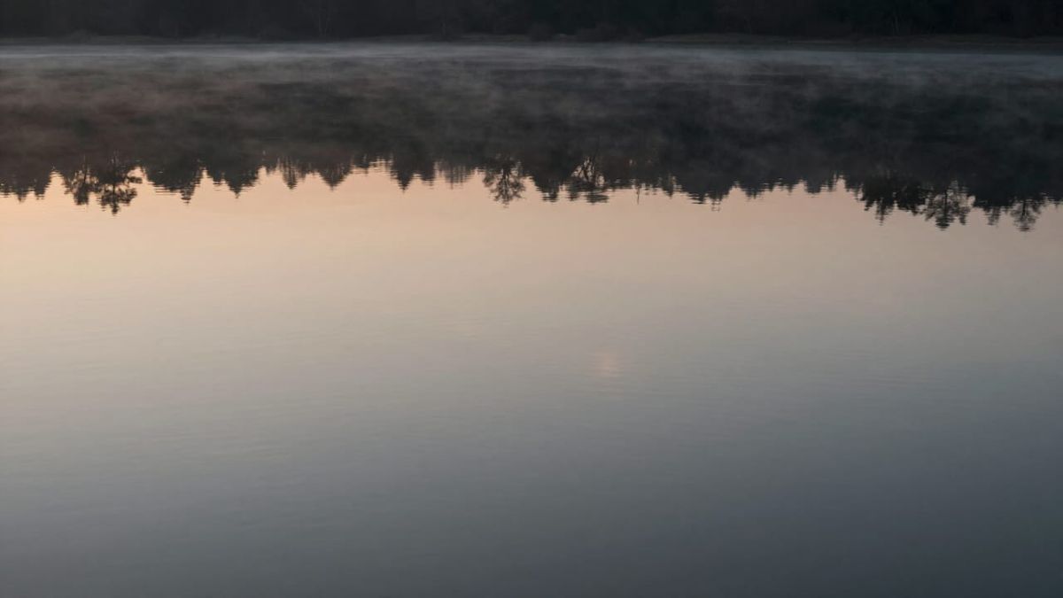 This image captures a breathtakingly still body of water at dawn, showcasing flawless reflections of the surrounding landscape. The scene's serene and mysterious mood is amplified by muted colors and soft, diffused light, rendered in high realism.