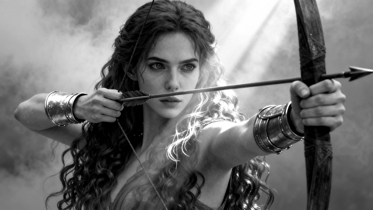 A detailed grey-toned manhwa illustration of a woman with dark grey hair and eyes, drawing a bow. Ethereal volumetric light rays enhance the dramatic scene.