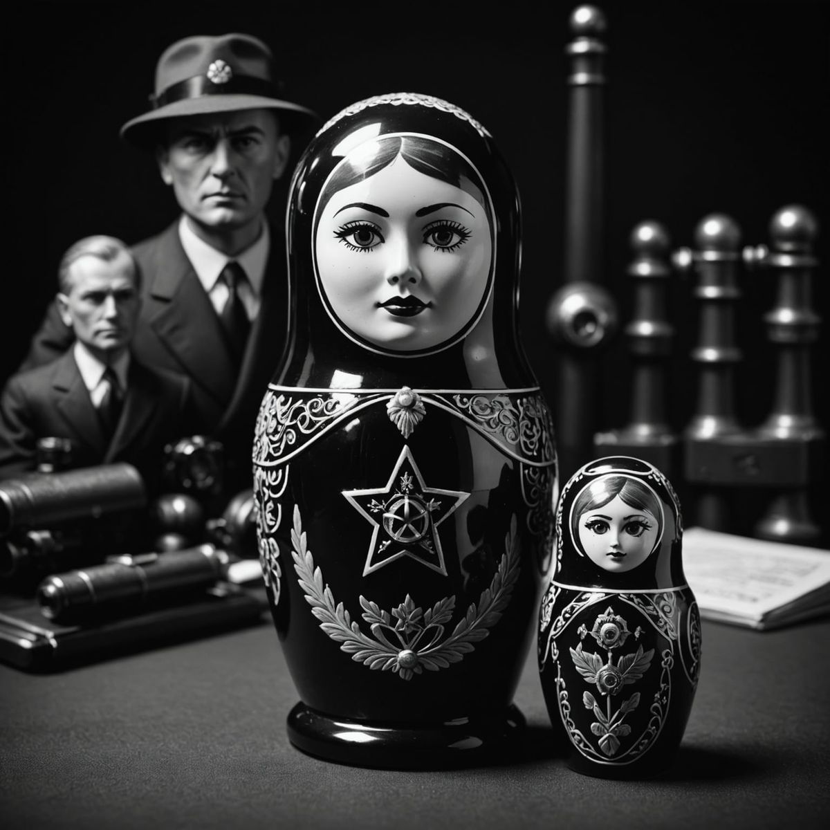 This image shows a Russian nesting doll reimagined as a KGB secret agent, rendered in a film noir style. The artwork evokes a sense of mystery and intrigue.