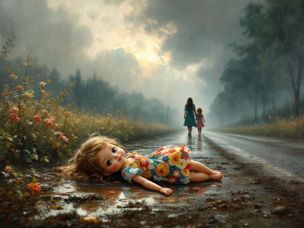 This fine art oil painting features a detailed, colorful doll on the ground near a road, with a mother and daughter walking away in the distance under a gloomy, rainy sky.
