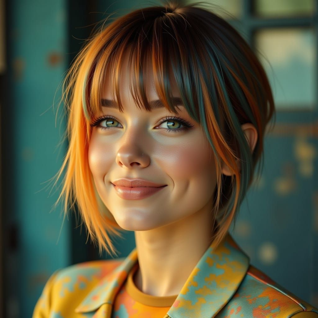This image shows a striking portrait of a woman with a guillotine haircut and tie-dye clothing, featuring detailed skin and sharp focus. The artwork is rendered in a soft oil painting style with vibrant amber and teal colors.