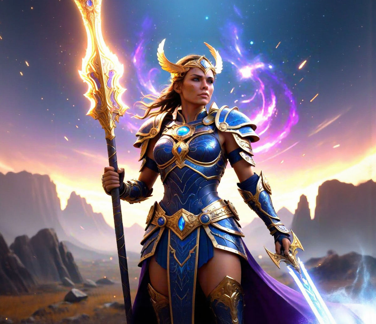 A stunning image of a Valkyrie warrior on a glowing battlefield. The ornate armor features celestial patterns, and cosmic energy crackles around her spear. This digital artwork has intricate detail and a dark fantasy aesthetic.