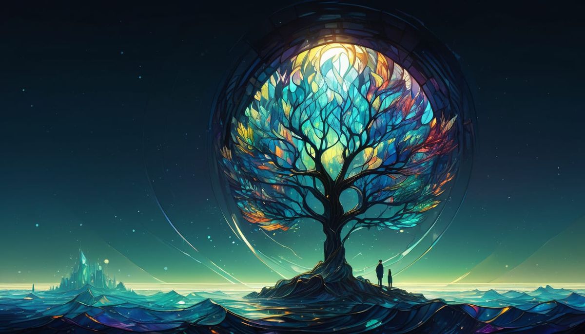 This stunning image showcases a hyper-realistic stained glass artwork, featuring breathtaking colors and intricate details, reminiscent of Louis Comfort Tiffany's opulent pieces, with sunlight diffraction and iridescence adding to its majesty.