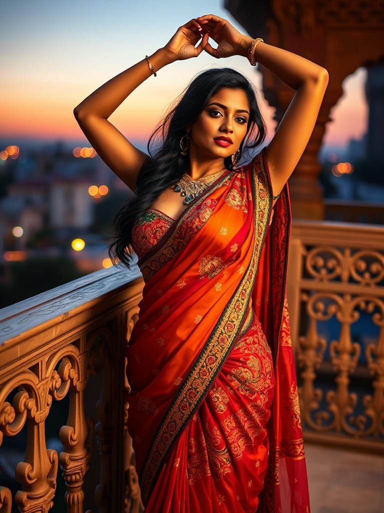 This image showcases an Indian model in a stunning, intricately embroidered saree, posing on a romantic balcony at dusk. The warm golden light highlights her curves and the lush textures of the fabric, with the soft city lights twinkling in the background like diamonds.