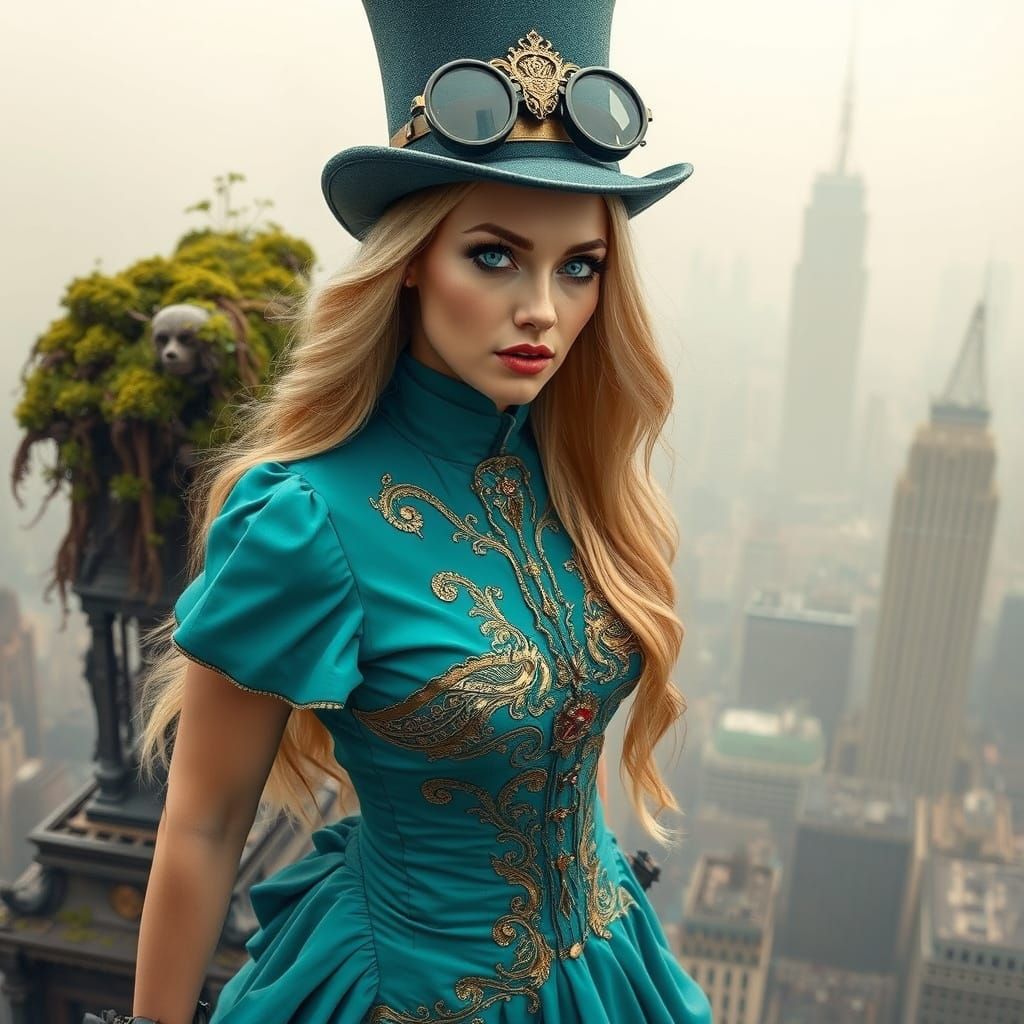 A woman with blonde hair and turquoise eyes in a steampunk dress and hat stands on a skyscraper overlooking a green, overgrown dystopian city. Evokes a retro-futuristic aesthetic.