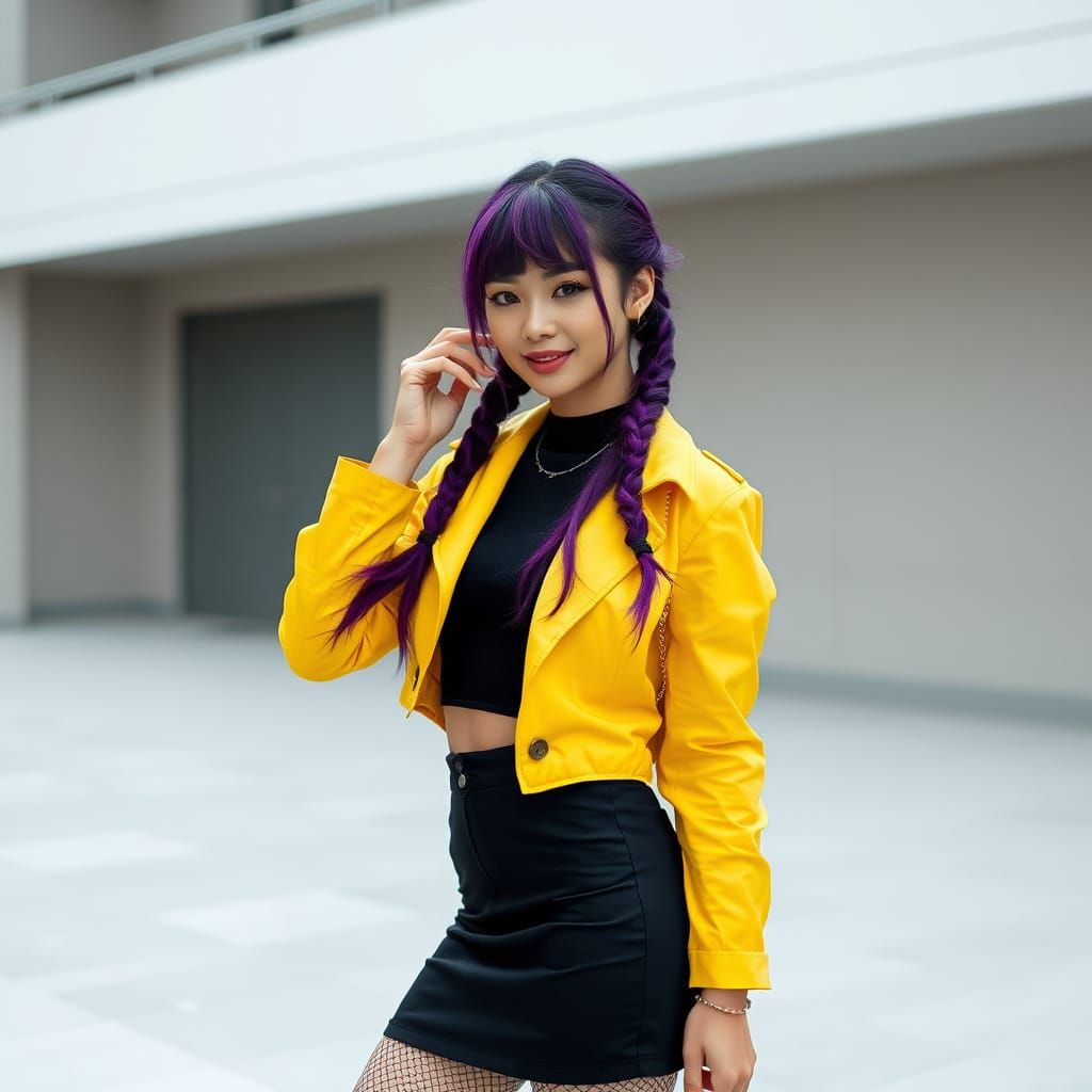This image shows a confident purple-haired woman in a yellow jacket and black skirt. The artwork blends bold lines, intricate textures, and a vibrant color palette in a dynamic illustrative style.