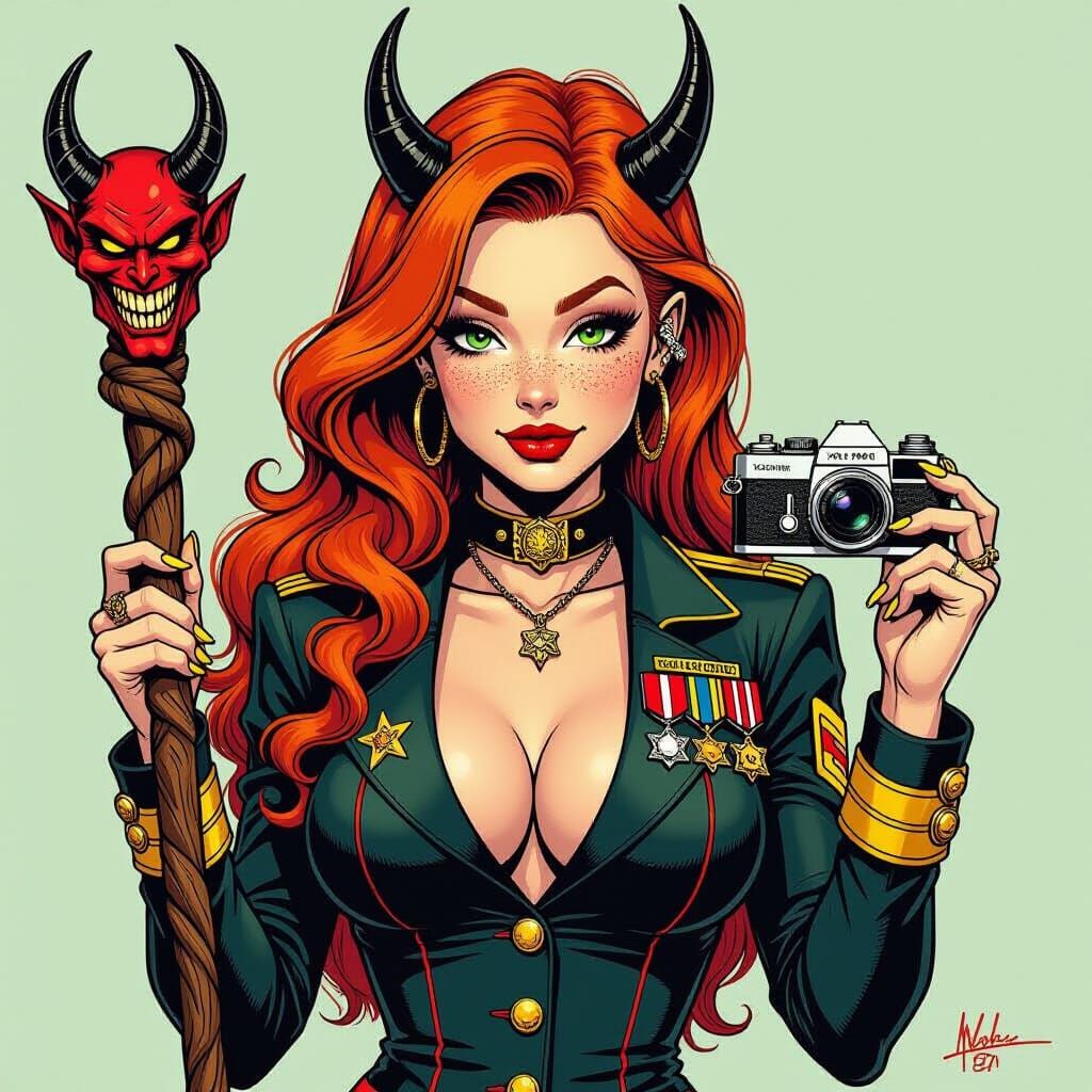 A vibrant comic art illustration of a striking young woman in a detailed uniform, holding a devil-carved walking stick and a camera. Features dramatic shadows and dynamic linework.