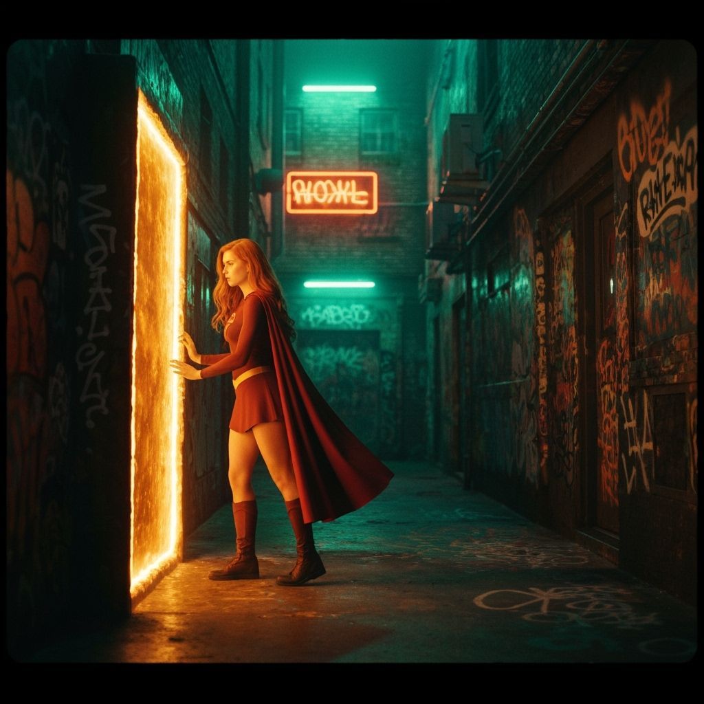 A striking picture of a red-haired supergirl guarding a glowing dimensional portal in a graffiti-filled alley. The scene is lit with neon colors and rendered with cinematic lighting and film grain.