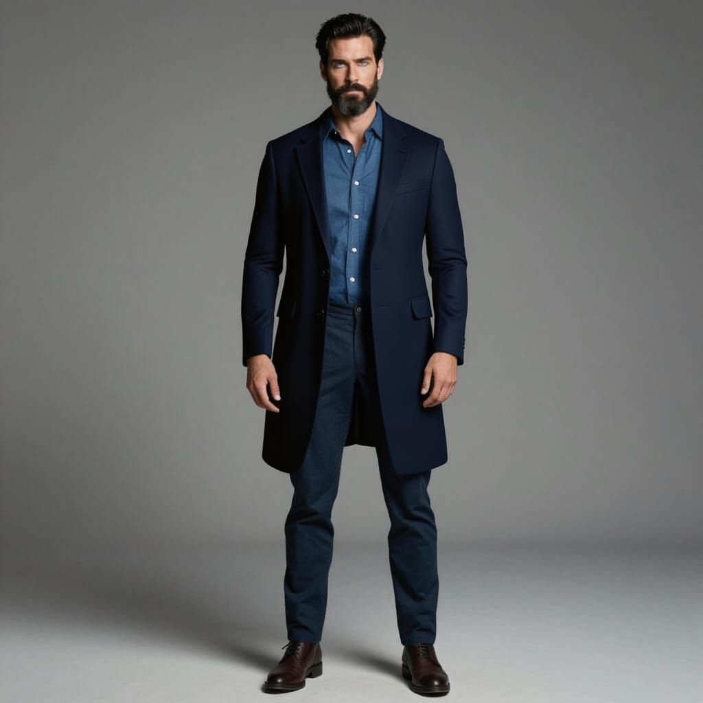 This image features a tall, muscular Caucasian man in his mid-30s. He has neat black hair, a beard with grey, blue eyes, and wears business casual clothing in blue with dark brown boots.
